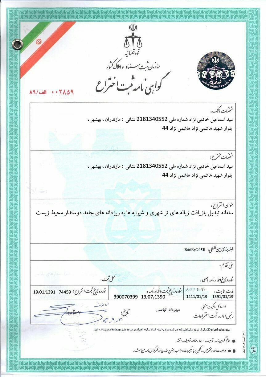 این در حالی است که خاتمینژاد درباره اختراع خود به خبرنگار اجتماعی خبرگزاری تسنیم میگوید: این دستگاه، زبالههای تر شهری را به کود و شیرابهها را به ریزدانههای دوستدار محیط زیست که در تهیه سنگ و بلوک قابل استفاده است تبدیل میکند.