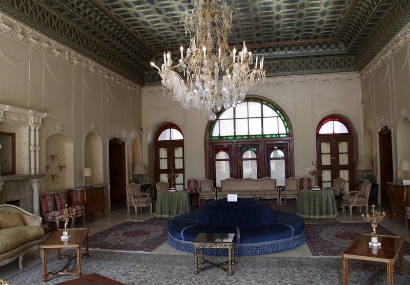 در جلو ایوان بزرگ عمارت نیز چهار ستون بلند ساخته شده است. سقف ایوان با قطعات چوبی پوشیده شده و روی آنها با رنگ و روغن نقاشی شده است. سر ستون‌های ایوان گچ بری شده و در بالای آنها گل‌ها به تقلید از نقوش تخت جمشید گچ بری شده است.