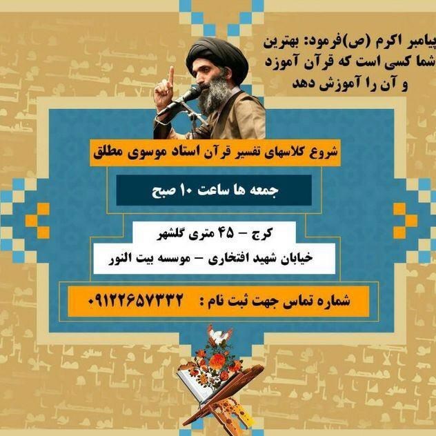 به گزارش خبرنگار فرهنگی باشگاه خبرنگاران پویا، کلاسهای تفسیر قرآن حجتالاسلام و المسلمین سیدعباس موسوی مطلق از فردا جمعه 23 تیرماه از ساعت 10 صبح آغاز میشود.