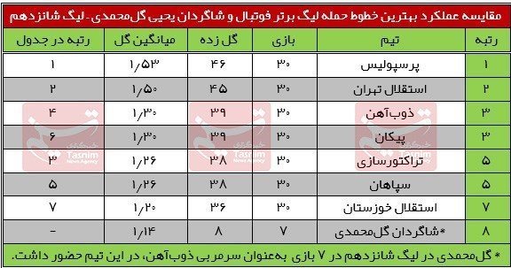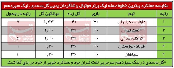 فولاد خوزستان قهرمان و سپاهان رده چهارمی نیز در 30 بازی 36 گل به ثمر رسانده و میانگین 1.2 گل را بری هر بازی ثبت کردند تا در ردههای بعدی جدول بهترین خطوط حمله لیگ سیزدهم قرار بگیرند.