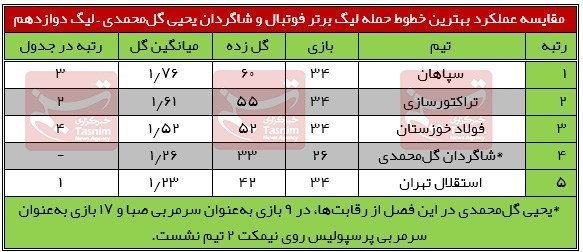 بدین ترتیب، شاگردان گلمحمدی درمجموع 26 بازی از لیگ دوازدهم 33 گل به ثمر رسانده و میانگین 1.26 گل را برای هر بازی ثبت کردند. در لیگ دوازدهم، عنوان بهترین خط حمله در اختیار تیم فوتبال سپاهان بود که مهاجمان این تیم 60 گل در 34 بازی به ثمر رسانده و میانگین 1.76 گل زده در هر بازی را ثبت کرده بودند.