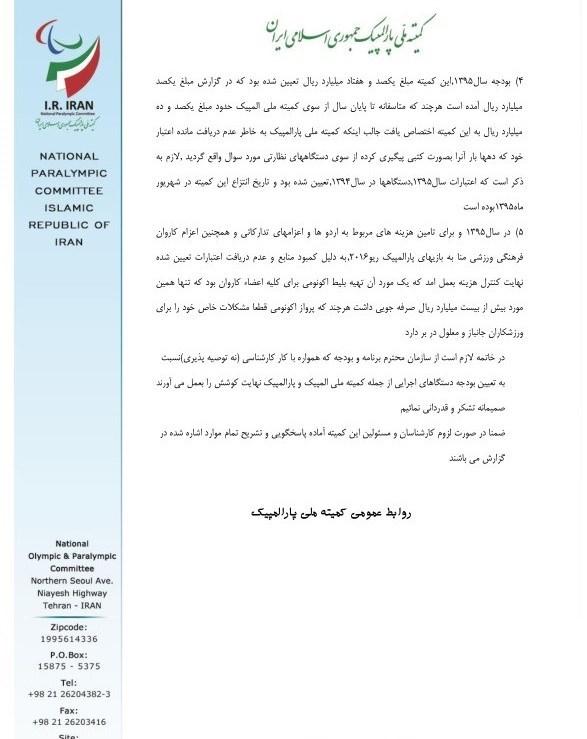 احتراما پیرو خبر منعکس شده در آن خبرگزاری در تاریخ 19 تیرماه سالجاری به شناسه 1459382 با تیتر "110 روز گذشت، خبری از پول در کمیته ملی المپیک نشد / ردپای کمیته پارالمپیک در بودجه 96 " ؛ در بخش مربوط به سهم پارالمپیک در بودجه آمده است «این درحالی است که فدراسیونهای کمی زیرمجموعه کمیته پارالمپیک هستند و این نهاد برخلاف کمیته المپیک هیچ رویداد آسیایی یا پاراآسیایی ندارد.»