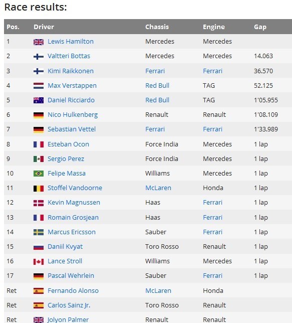 والتری بوتاس، دیگر راننده تیم مرسدس با 14 ثانیه اختلاف پس از همیلتون در جایگاه دوم قرار گرفت و کیمی رایکونن، راننده فنلاندی تیم فِراری، سوم شد. سباستین فتل، راننده آلمانی تیم فراری نیز با پنجری لاستیک جلو به عنوانی بهتر از هفتمی نرسید.