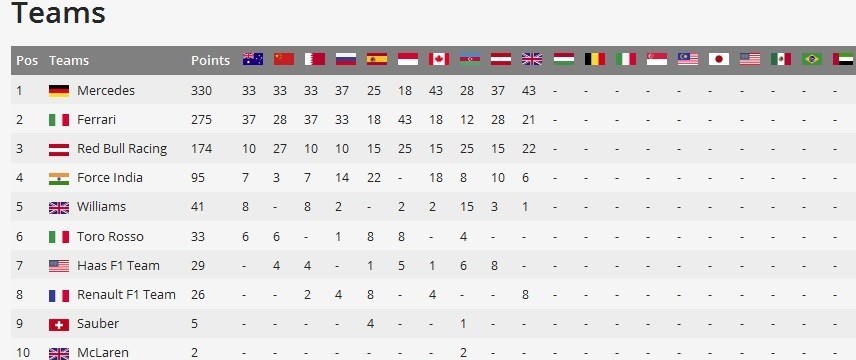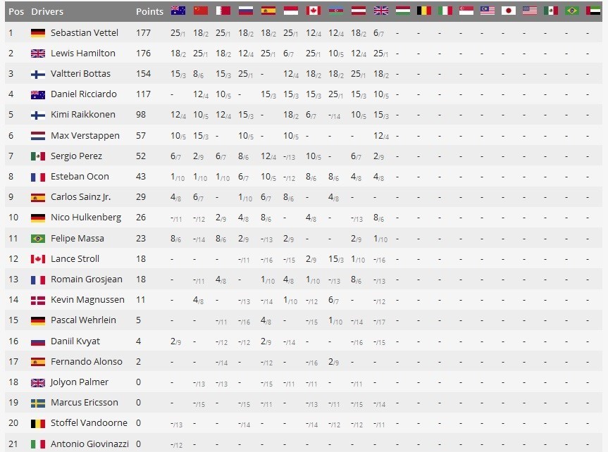 در رده بندی نهایی، سباستین فتل با تنها یک امتیاز اختلاف، بالاتر از همیلتون در جایگاه نخست قرار دارد و کیمی رایکونن سوم است. در رده بندی تیمی نیز مرسدس پیشتاز است.