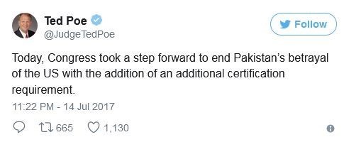 «تد پو» سناتور ارشد آمریکایی و شخصیت اصلی پشت این طرح، پس از رای آوردن این طرح در صفحه شخصی خود در توبیتر این طرح را «گام بزرگ کنگره برای پایان دادن به خیانت پاکستان علیه آمریکا» عنوان کرد.
