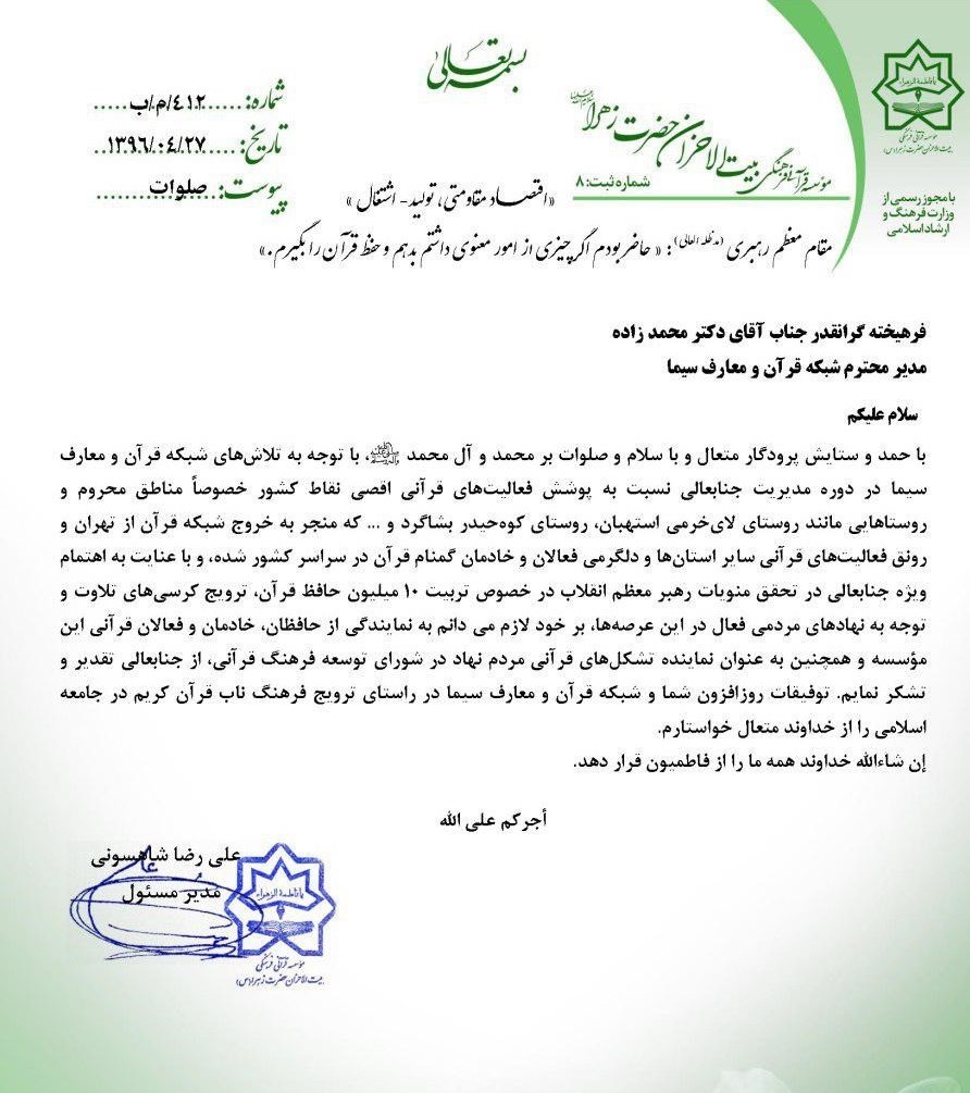 مدیر مسؤل مؤسسه قرآنی بیت‌الاحزان حضرت زهرا(س) طی نامه‌ای ازاهتمام مدیر شبکه قرآن و معارف سیما به پوشش رسانه‌ای فعالیت‌های قرآنی در مناطق محروم کشور تشکر و قدردانی کرد.
