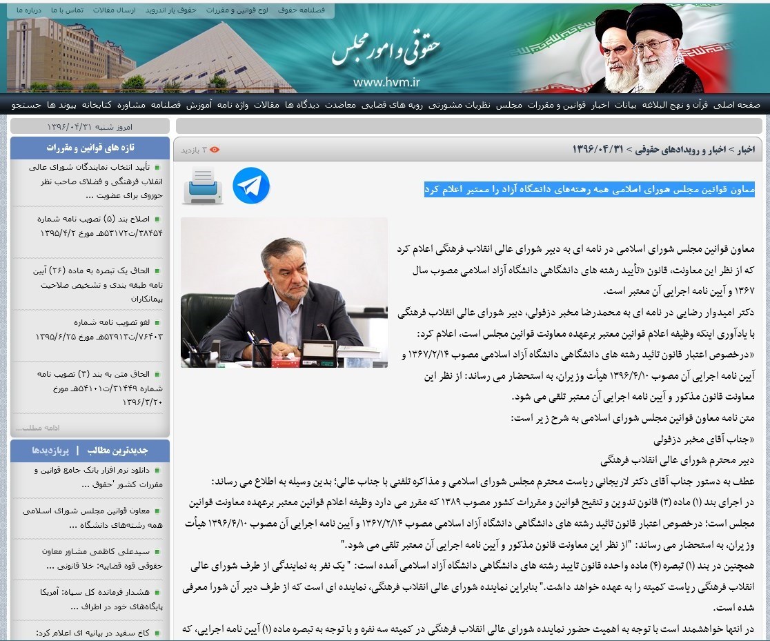 در اجرای بند (1) ماده (3) قانون تدوین و تنقیح قوانین و مقررات کشور مصوب 1389 که مقرر می دارد وظیفه اعلام قوانین معتبر برعهده معاونت قوانین مجلس است؛ درخصوص اعتبار قانون تائید رشته های دانشگاهی دانشگاه آزاد اسلامی مصوب 1367/2/14 و آیین نامه اجرایی آن مصوب 1396/4/10 هیأت وزیران، به استحضار می رساند: "از نظر این معاونت قانون مذکور و آیین نامه اجرایی آن معتبر تلقی می شود."