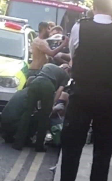 مورد دیگر نوجوانی را نشان میدهد که روی سکوی پیادهرو نشسته و مورد رسیدگیهای پزشکی است.
