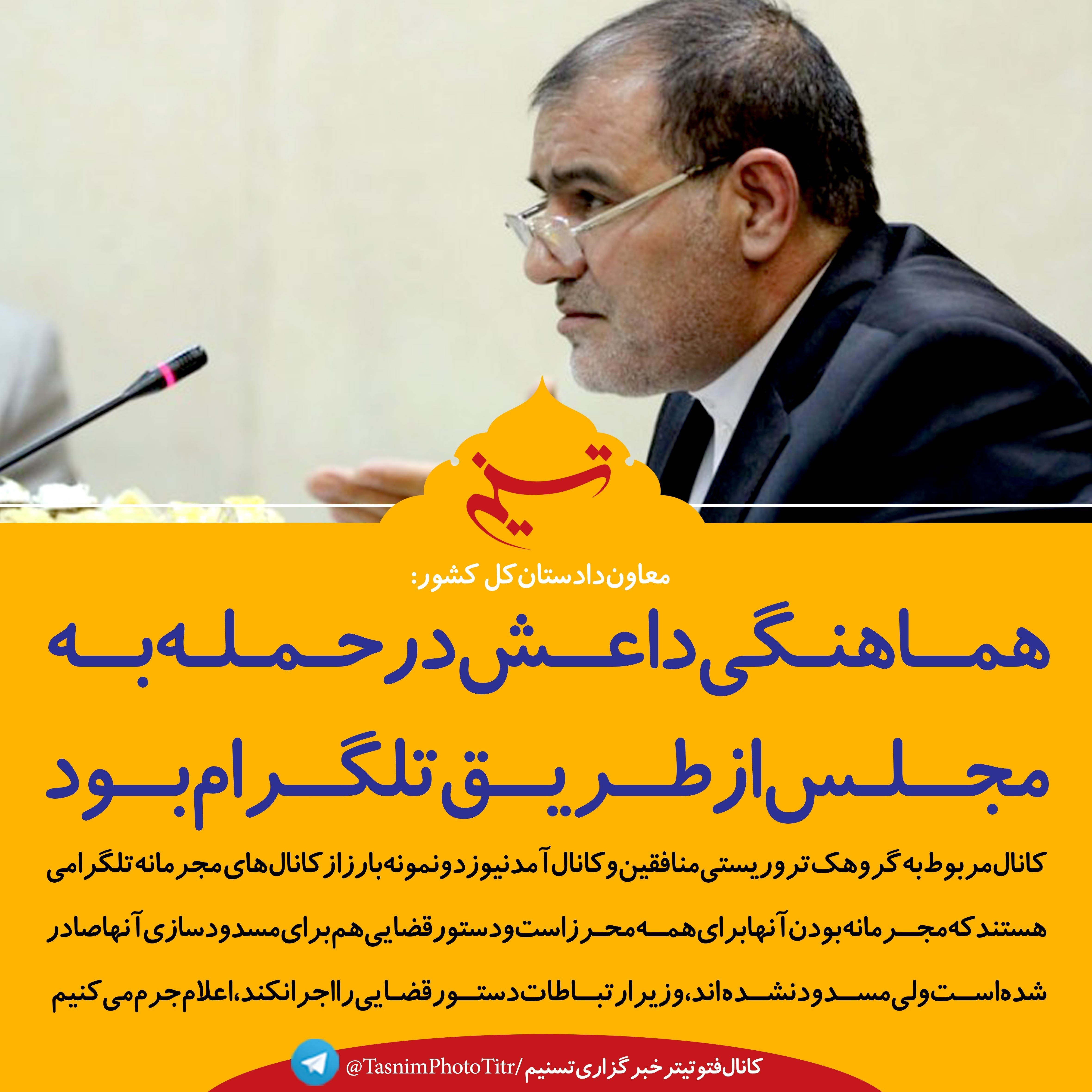 معاون دادستان کل کشور می‌گوید داعش تمام هماهنگی‌های خود برای حمله تروریستی به مجلس شورای اسلامی را از طریق تلگرام انجام داده است. او گفته اگر از این به بعد، وزیر ارتباطات دستورهای قضایی را اجرا نکند، اعلام جرم می‌شود.