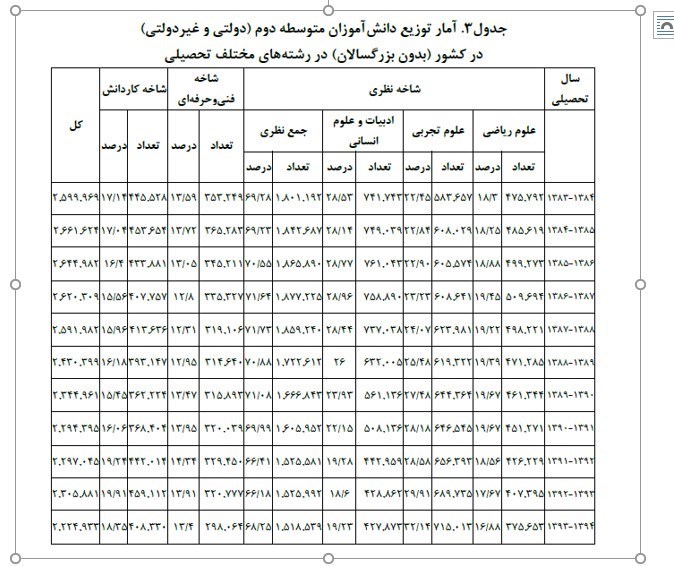 این خلاصه آنچه در طی سالها بر هدایت دانش آموزان رخ داده است، حال اگر نگاهی به نتایج تاثیرگذاری اقدامات انجام شده در متوازنسازی رشتهای در مدارس بیافکنیم متوجه میشویم که این اقدامات تا چه اندازه موثر بوده است. در زیر آمار توزیع دانشآموزان متوسطه دوم در طی ادوار گذشته بر اساس گزارش مرکز پژوهشهای مجلس شورای اسلامی را مشاهده میکنیم.