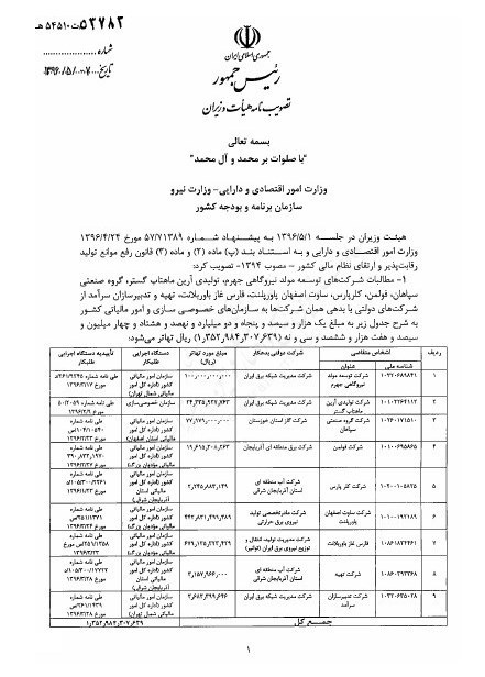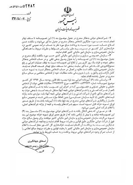 در بخشی از این ابلاغیه آمده است: مطالبات شرکت های توسعه مولد نیروگاهی جهرم، تولیدی آرین ماهتاب گستر، گروه صنعتی سپاهان، فولمن، کلرپارس، ساوت اصفهان پاورپلانت، تهیه و تدبیرسازان سرآمد از شرکت های دولتی با بدهی همان شرکت ها به سازمان های خصوصی سازی و امور مالیاتی کشور به شرحی که در جدول آمده است به مبلغ یک هزار و سیصد و پنجاه و دو میلیارد و نهصد و هشتاد و چهار میلیون و سیصد و هفت هزار و ششصد و سی و نه ریال تهاتر می شود.