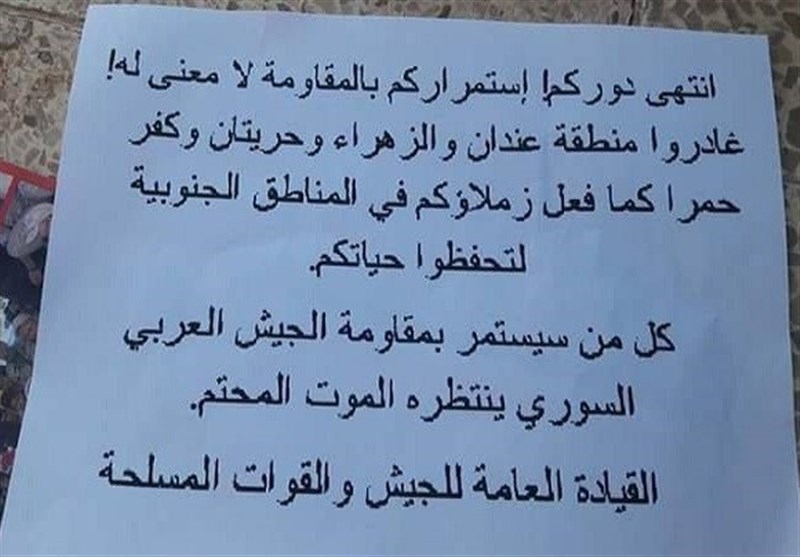 منابع سوری نیز از اقدام بالگردهای ارتش در پرتاب بروشورهایی در شهرکهای عندان، الزهراء، حریتان و کفرحمره در حومه شمالی حلب خبر دادند که در این بروشورها از افراد مسلح خواسته شده است این شهرکها را ترک کنند.