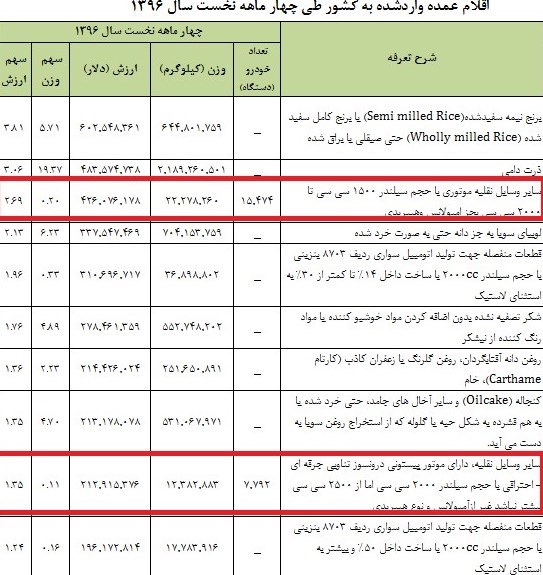 بر اساس داده های موجود گمرک ایران در سال گذشته آمارهای تجارت خارجی را به صورت مقایسه ای منتشر مینمود، که در حال حاضر این رویه متوقف شده است. بر این اساس در 4ماه نخست سال 95 حدود 15 هزار خودرو با حجم موتور 1500تا 2500 سی سی با ارزش 390 میلیون دلار به کشور وارد شده، این در حالی است که تا تیر ماه سال 94 حدود 11 هزار خودرو با حجم موتور مذکور وارد کشور شده بود.