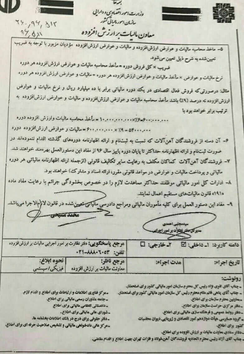 گفتنی است بر اساس بند یک دستور العمل مذکور، ضریب مزبور صرفا برای تعیین ماخذ مشمول مالیات و ارزش افزوده اشخاص حقیقی حاضر در انتهای زنجیره فروش آهن آلات خواهد بود. لذا فروشندگان آهن در هنگام فروش این محصول مجاز به دریافت مالیات و ارزش افزوده مازاد بر قیمت فروش نخواهند بود.