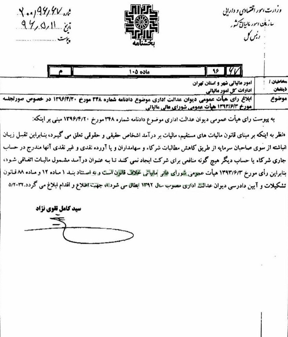 در رای دیوان آمده است، نظر به اینکه بر مبنای قانون مالیاتهای مستقیم، مالیات بر درآمد اشخاص حقیقی و حقوقی تعلق میگیرد، بنابراین تقبل زیان انباشته از سوی صاحبان سرمایه از طریق کاهش مطالبات شرکا و سهامدارن یا آورده نقدی و غیر نقدی آنها مندرج در حساب جاری شرکا یا حساب دیگر هیچ گونه منافعی برای شرکت ایجاد نمیکند تا به عنوان درآمد مشمول مالیات اتفاقی شود.