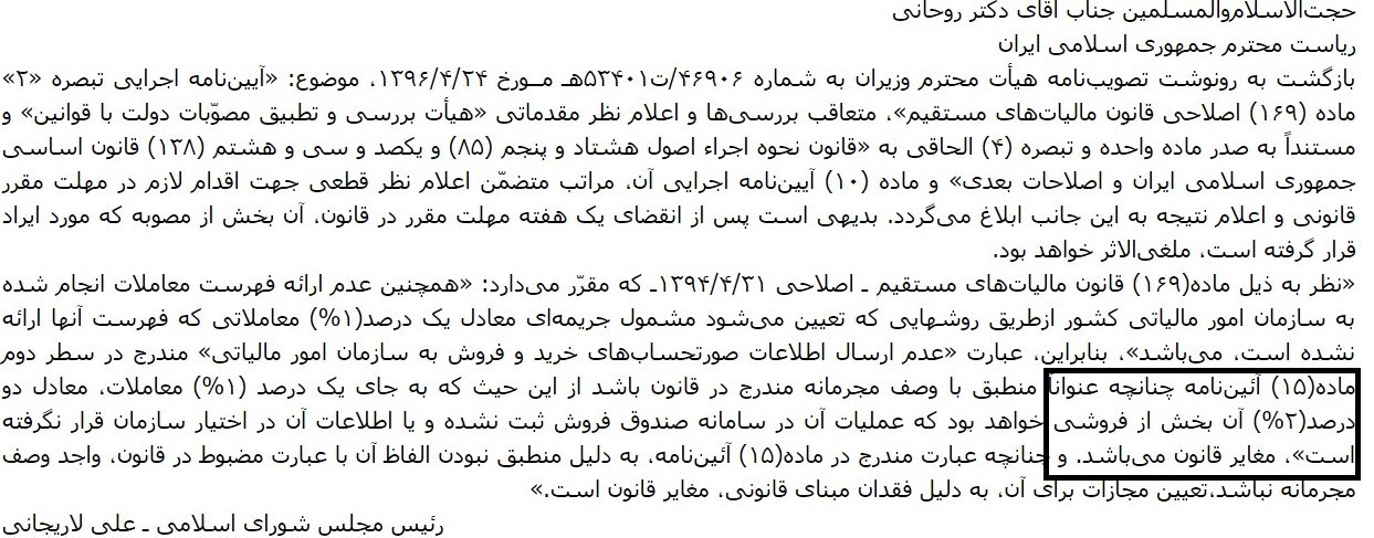 در نامه‌ی رییس مجلس به رئیس جمهور،  اعلام شد پس از بررسی های هیئت بررسی و تطبیق مصوبات دولت با قوانین، برخی از مواد آیین نامه تبصره 2ماده 169  درباره جریمه متخلفان مالیاتی مغایر با قانون تشخیص داده شده است.