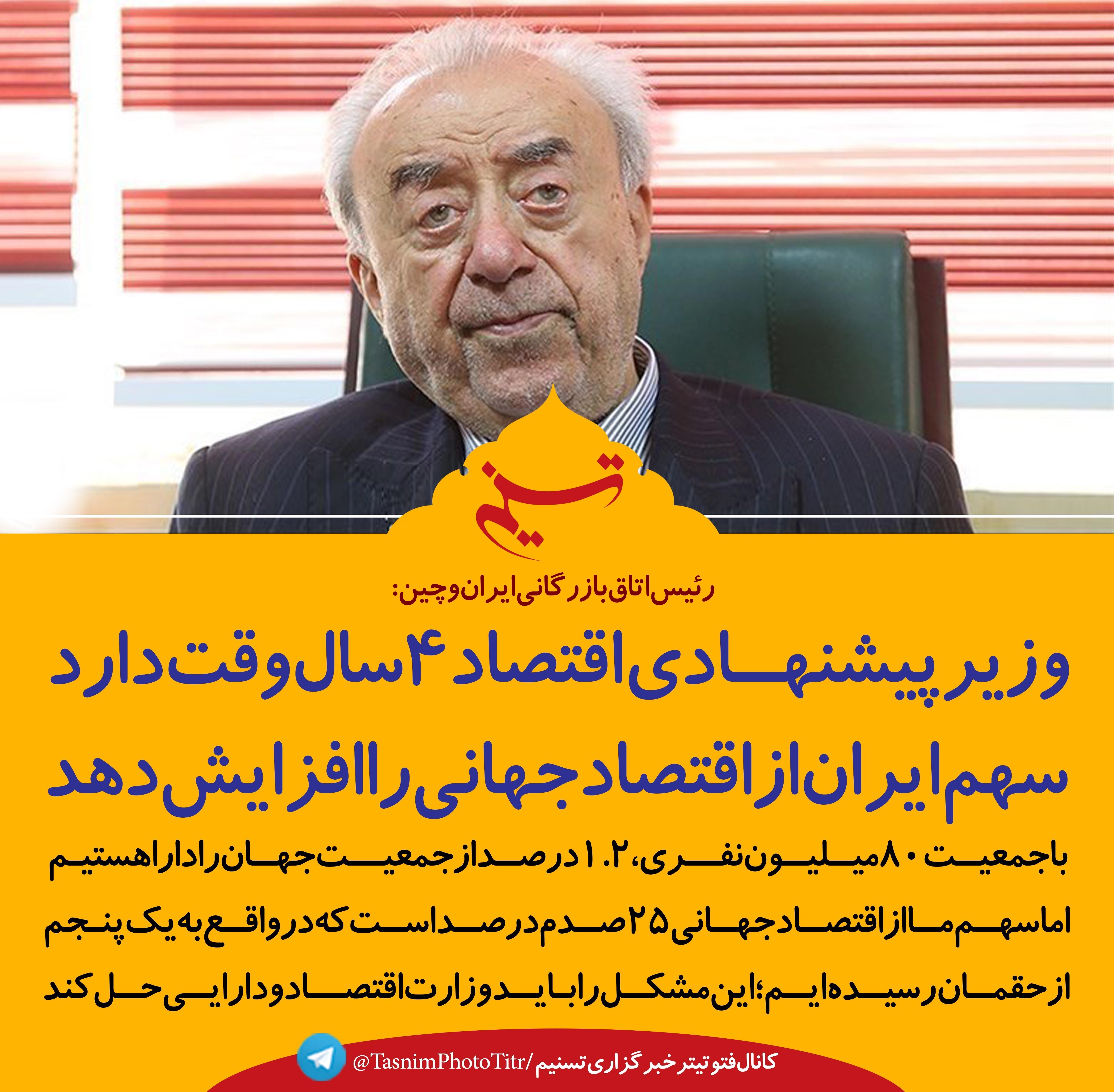 رئیس اتاق بازرگانی ایران و چین گفت: با جمعیت 80 میلیون نفری، 1.2 درصد از جمعیت جهان را دارا هستیم اما سهم ما از اقتصاد جهانی 25 صدم درصد است که در واقع به یک پنجم از حقمان رسیده‌ایم؛ این مشکل را باید وزارت اقتصاد و دارایی حل کند.