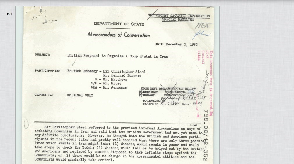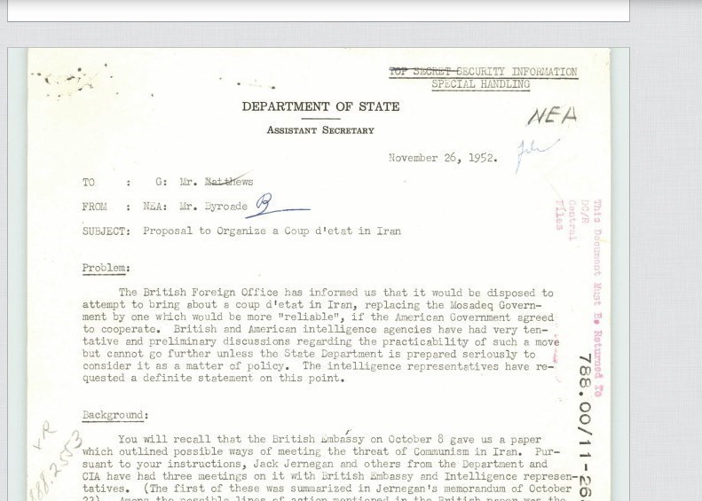 این دو سند که پایگاه «آرشیو امنیت ملی آمریکا» آن را منتشر کرده یادداشت‌هایی مربوط به وزارت خارجه آمریکا هستند و نشان می‌دهند که مقام‌های انگلیسی چندین بار از اکتبر سال 1952 (مهرماه 1331) تلاش کرده‌اند طرف آمریکایی را برای کودتا علیه دولت وقت ایران متقاعد کنند.