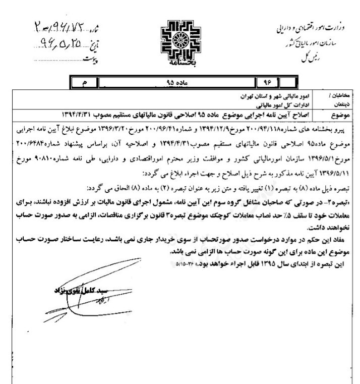به گزارش خبرنگار اقتصادی باشگاه خبرنگاران پویا؛ بر اساس بخشنامه رئیس سازمان مالیاتی، در صورتی که صاحبان مشاغل گروه سوم موضوع آیین نامه ماده 95 قانون مالیاتهای مستقیم، مشمول اجرای قانون مالیات بر ارزش افزوده نباشند، برای معاملات خود تا سقف 0.5درصد حد نصاب معاملات کوچک موضوع تبصره 3 قانون برگزاری مناقصات، الزامی به صدور صورت حساب نخواهند داشت.