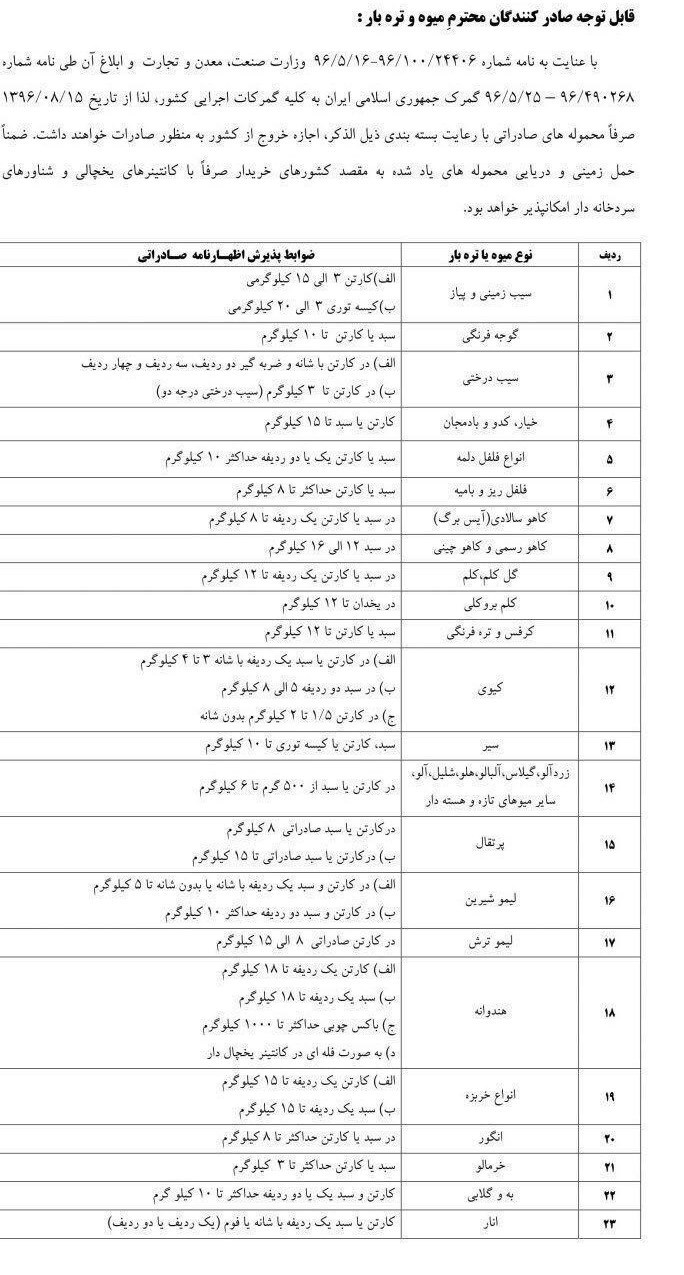 این جدول شامل شرایط بسته بندی برای 23 نوع میوه و تره بار مختلف میباشد. پیش از این صادرات محصولاتی مانند هندوانه به کشورهای حاشیه خلیج فارس به صورت فله ای و به کمک لنجها با حواشی همراه شده بود که در حال حاضر این محصول تنها با استفاده از کارتن، سبد، باکس چوبی و یا فله ای صرفا در کانتینرهای یخچال دار صورت خواهد گرفت.
