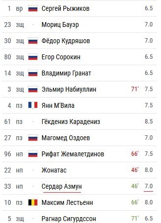 در این میان خبرگزاری ورزشی چمپیونات روسیه در ارزیابی فنی عملکرد بازیکنان دو تیم روبین کازان و آنژی به سردار آزمون نمره خوب هفت را اختصاص داد. کارادانیز، مهاجم ترکیهای روبینکازان با دریافت نمره فنی 8.5 بهعنوان بهترین بازیکن میدان شناخته شد.