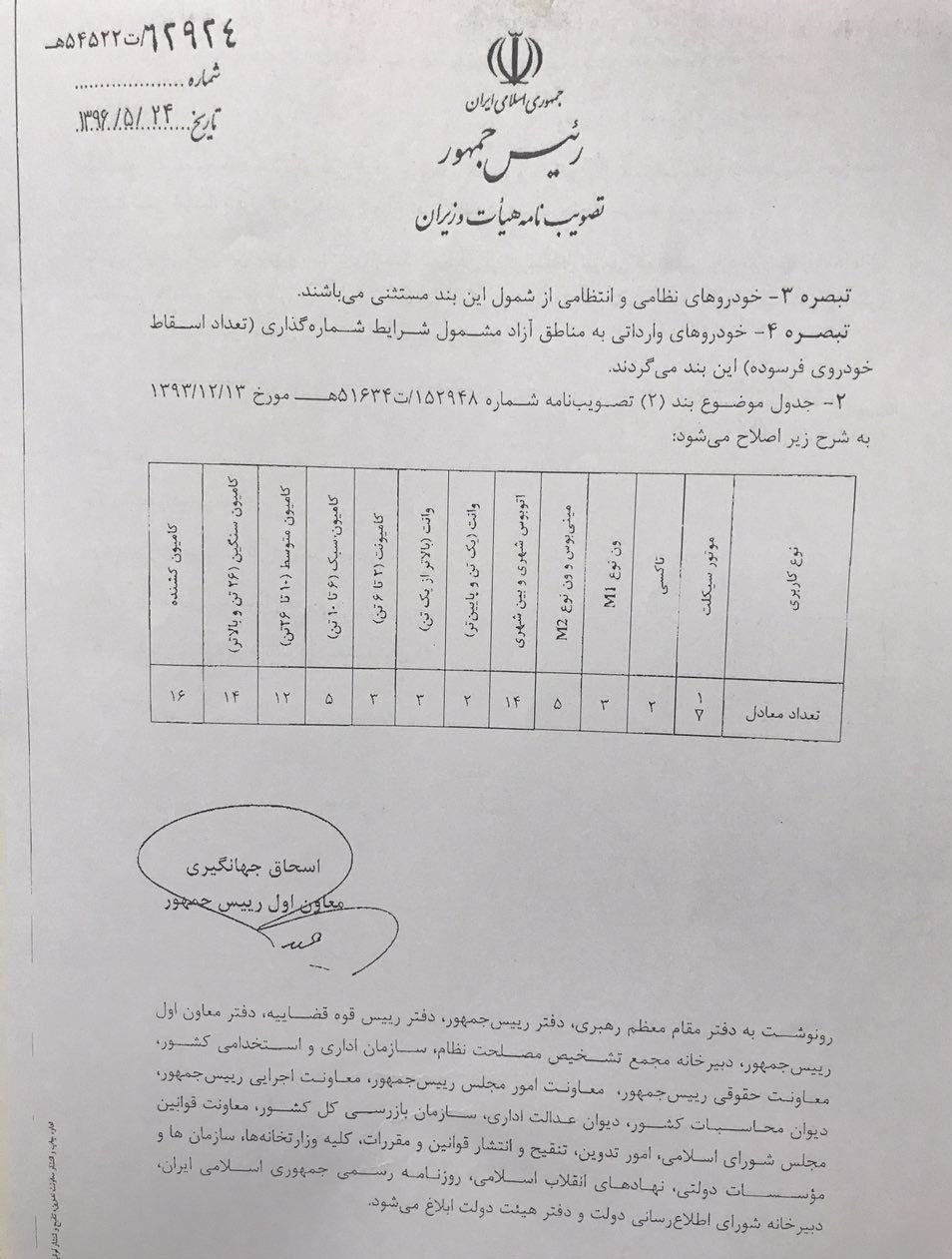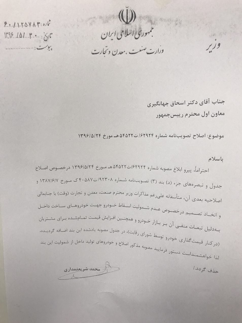 شریعتمداری در نامه خود به معاون اول تأکید کرده است" متأسفانه علی رغم مذاکرات وزیر سابق صنعت، معدن و تجارت با جنابعالی و اتخاذ تصمیم در خصوص عدم شمولیت اسقاط خودرو جهت خودروهای ساخت داخل به دلیل تبعات منفی آن بر بازار خودرو و همچنین افزایش قیمت تمام شده برای مشتریان(در کنار قیمت گذاری خودرو توسط شورای رقابت)، در جدول مصوبه یاد شده این بند اضافه گردیده لذا خواهشمند است دستور فرمایید مصوبه مذکور اصلاح و خودروهای تولید داخل از شمولیت این بند حذف شود. "
