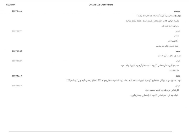 نمونه‌ای از این برخورد در تصویر زیر که یکی از مشترکان با مفقودی سیم‌کارت مواجه شده را شاهد هستیم در حالیکه این شرکت در سایتش ادعا کرده مرکز تماس 24 ساعته دارد اما ظاهرا ساعات اداری و محدود تعریف کرده است: