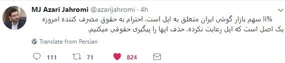 «11 درصد سهم بازار گوشی ایران متعلق به اپل است. احترام به حقوق مصرف کننده امروزه یک اصل است که اپل رعایت نکرده؛ حذف اپها را پیگیری حقوقی میکنیم».