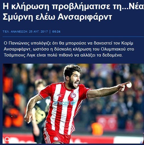 این سایت ورزشی یونانی در ادامه این خبر آورده است: رویارویی المپیاکوس با غولهای اروپایی از جمله بارسلونا و یوونتوس در لیگ قهرمانان اروپا باعث میشود تا توافق بر سر انتقال کریم انصاریفرد به تیم پانیونیوس دشوار شود. باشگاه پانیونیوس تمایل داشت تا در شرایط فعلی کریم انصاریفرد را حتی به صورت قرضی جذب کند اما قرعهکشی المپیاکوسیها در لیگ قهرمانان کار را پیچیده کرد.