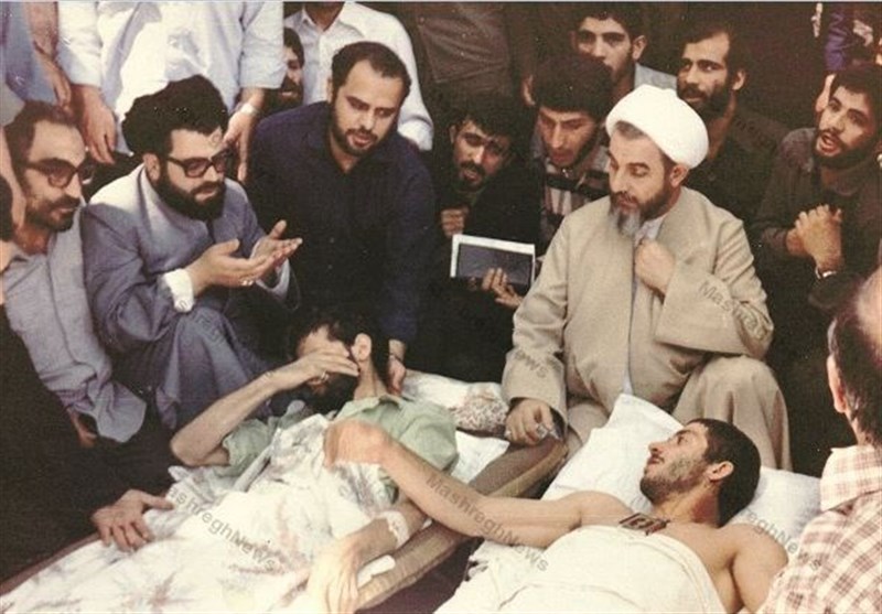 شهید لاجوردی در دیدار جانبازان؛ آیتالله محمدی گیلانی و حجتالاسلام موسوی تبریزی در تصویر دیده میشوند