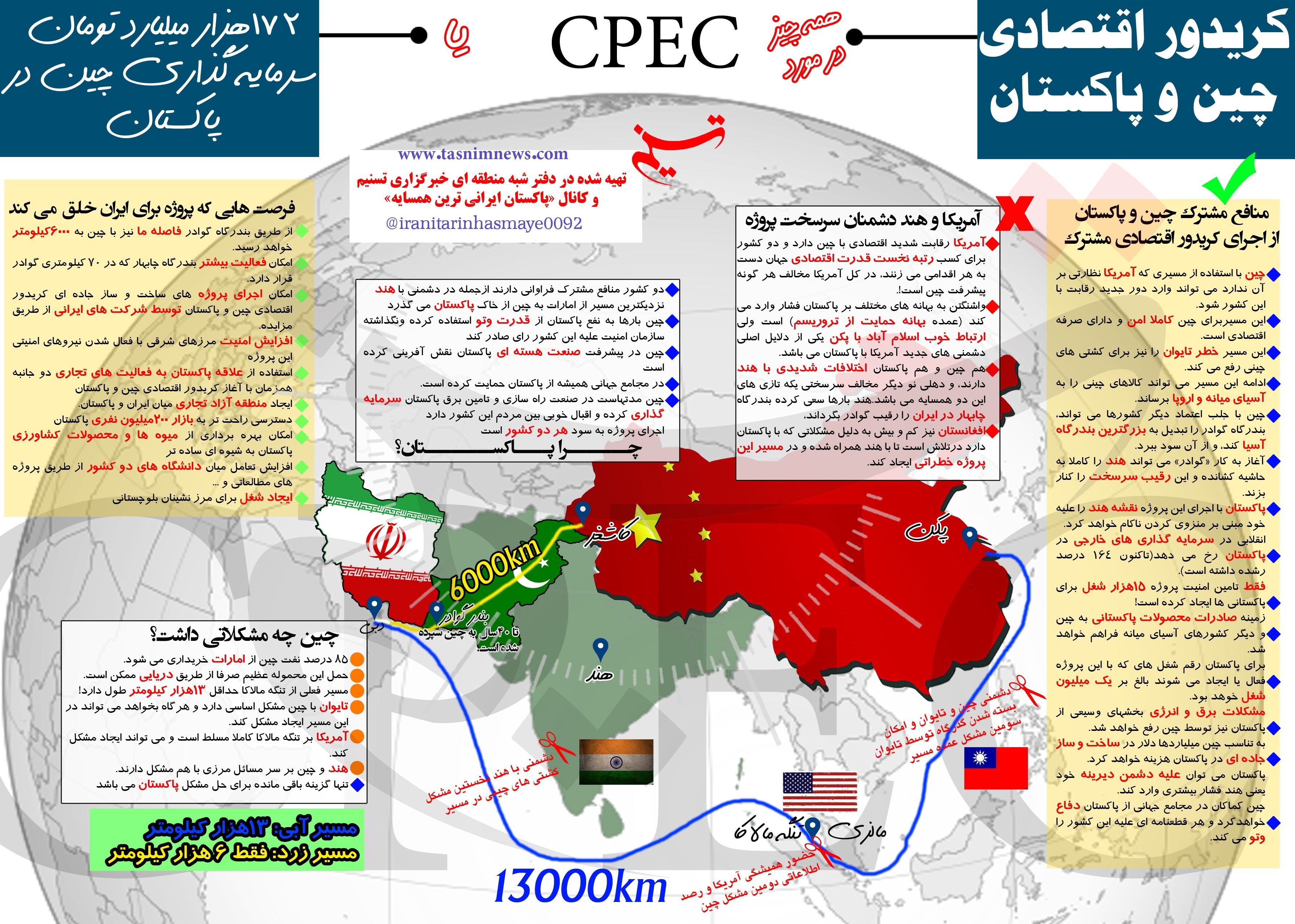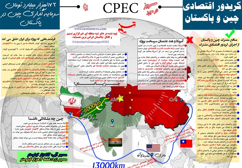 خبرگزاری تسنیم تلاش کرده در یک اینفوگرافی برای نخستین بار تمامی فرصتها، چرایی ها، و چالشهای پیش روی کریدور اقتصادی چین و پاکستان را به تصویر بکشد.