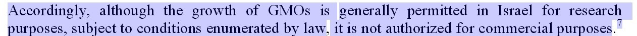 1. Accordingly, although the growth of GMOs is generally permitted in Israel for research purposes, subject to conditions enumerated by law, it is not authorized for commercial purposes.
