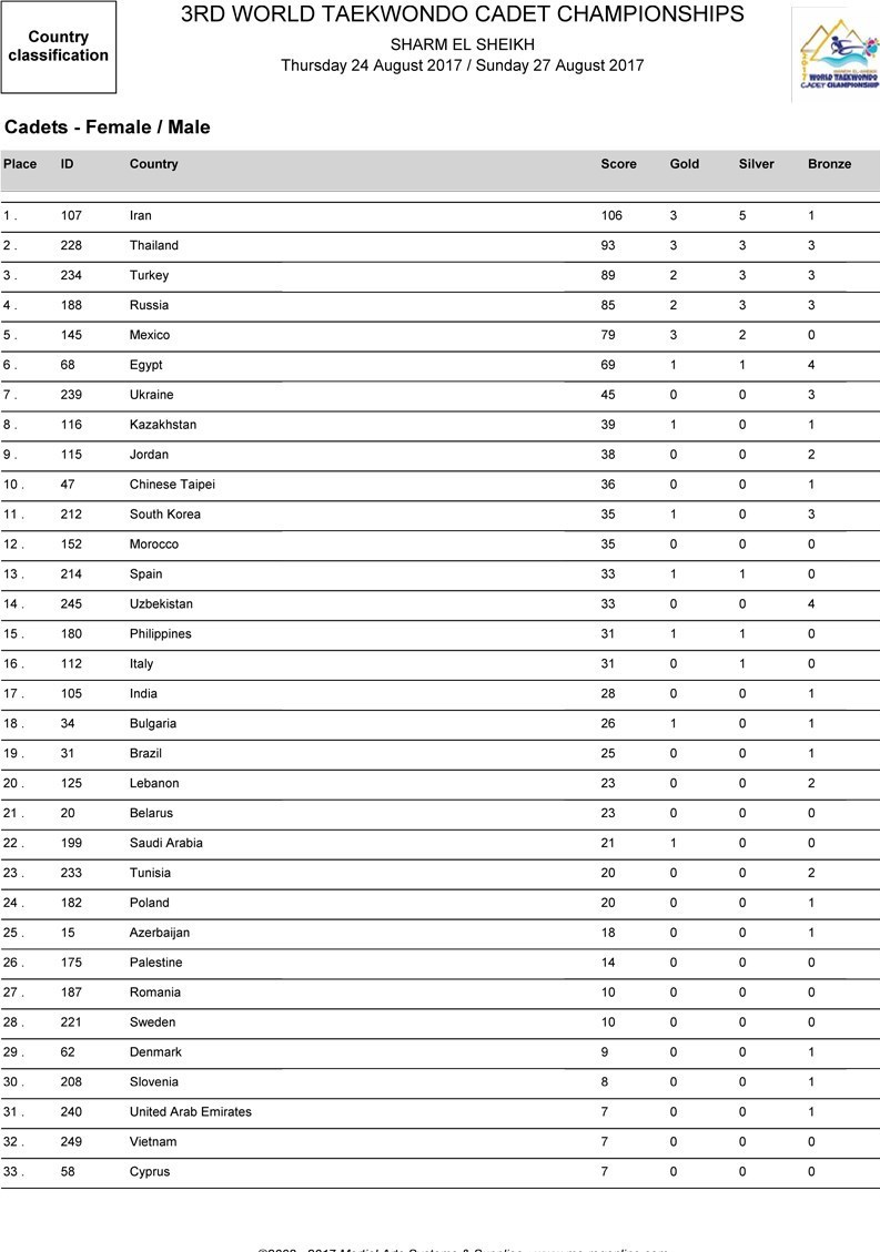 تیم تایلند با 3 طلا، 3 نقره و 3 برنز و 93 امتیاز بر سکوی نایب قهرمانی ایستاد و ترکیه با 2 مدال طلا، 3 نقره و 3 برنز سوم شد.