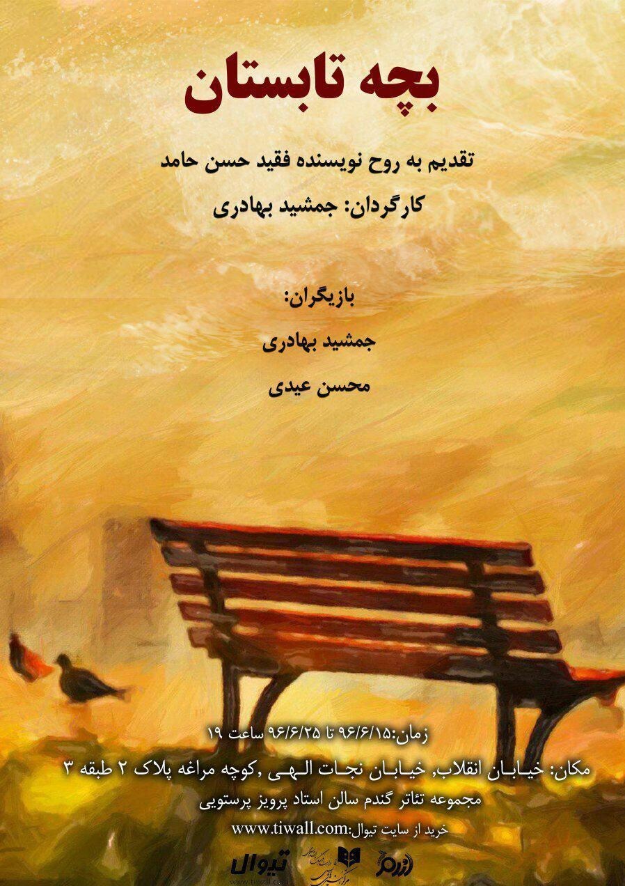 بچه تابستان به کارگردانی جمشید بهادری  و نویسندگی زنده‌یاد حسن حامد ١٥ تا ٢٥ شهریور ماه ساعت ١٩در تماشاخانه گندم سالن پرویز پرستویی روی صحنه می‌رود. جمشید بهادری و محسن عیدی در نمایش بچه تابستان به عنوان بازیگر به ایفای نقش پرداخته‌اند.