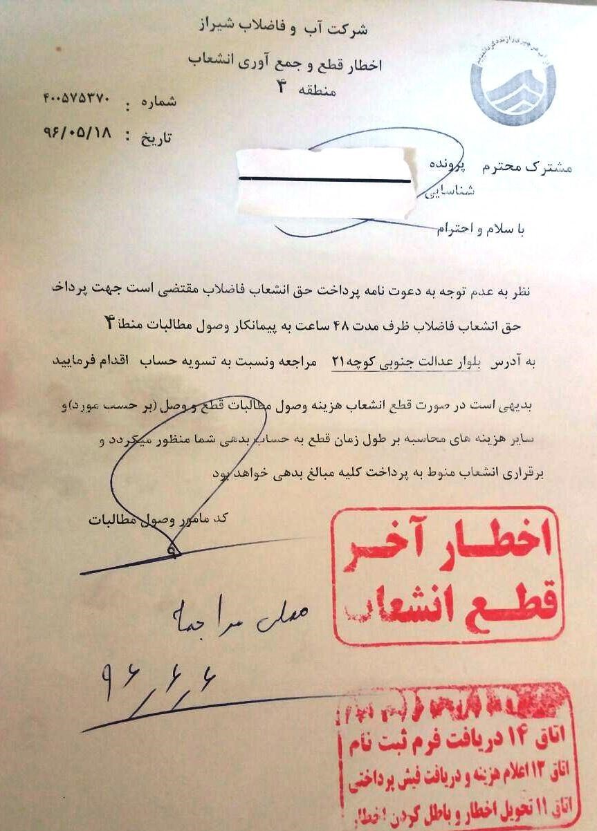 به گزارش خبرگزاری تسنیم از شیراز، شهروندان شیرازی در مناطق مختلف این کلان‌شهر، به ویژه در منطقه چهار شرکت آب و فاضلاب شیراز برگه‌هایی با عنوان اخطار قطع و جمع‌آوری انشعاب را دریافت کرده‌اند. برگه‌هایی که بسیاری از آنان معتقدند برای نخستین بار به درب منازل آنان ارسال و در آن اعلام شده است: نظر به عدم توجه به دعوت نامه پرداخت حق انشعاب فاضلاب مقتضی است برای پرداخت حق انشعاب فاضلاب در مدت 48 ساعت به پیمانکار وصول مطالبات منطقه مراجعه و نسبت به تسویه حساب اقدام فرمایید.