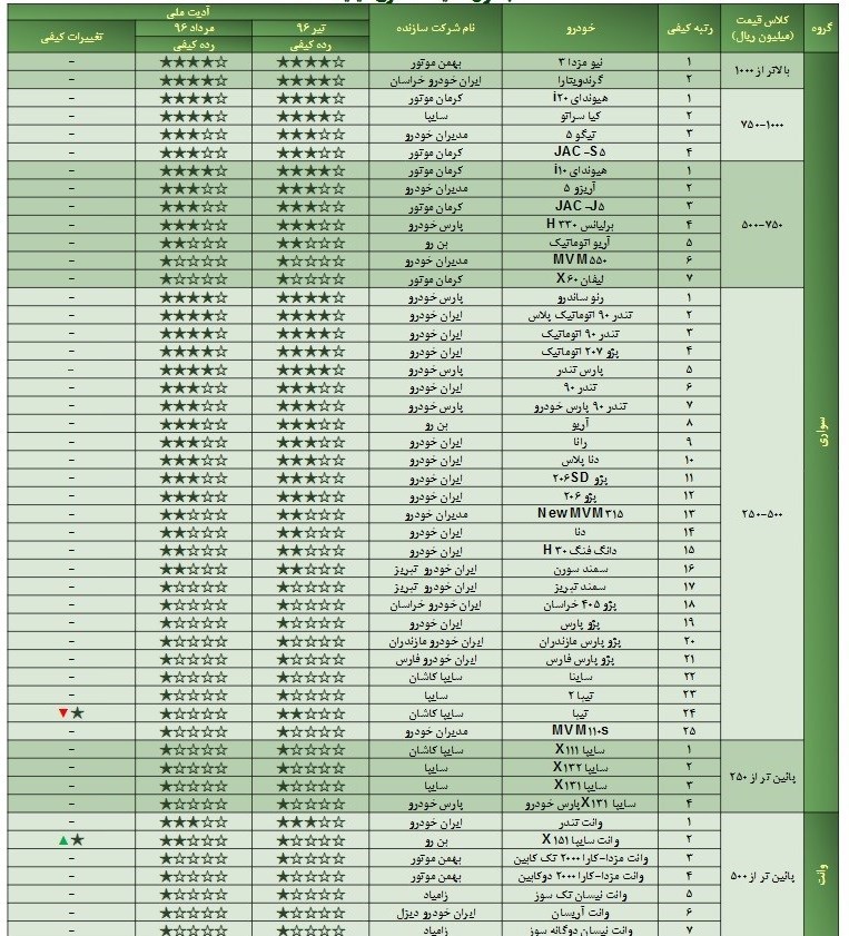 مطابق این گزارش، سمند تبریز، پژو 405 خراسان، پژو پارس، پژو پارس مازندران، پژو پارس فارس، ساینا، تیبا 2، تیبا، ام وی ام 110 مدل اس، سایپا 111، سایپا 132 و 131، سایپا 131 پارس خودرو همچنان در جرگهی خودروهای تکستاره قرار دارند.