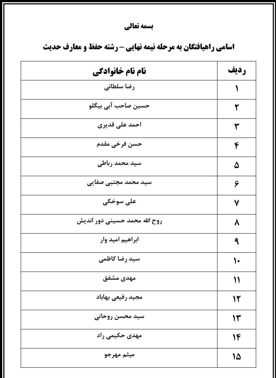 به گزارش خبرنگار باشگاه خبرنگاران پویا، طبق جدول ذیل عصر امروز 15 نفر در مرحله نیمهنهایی اولین مسابقات حفظ و معارف احادیث به رقابت با یکدیگر پرداختند.