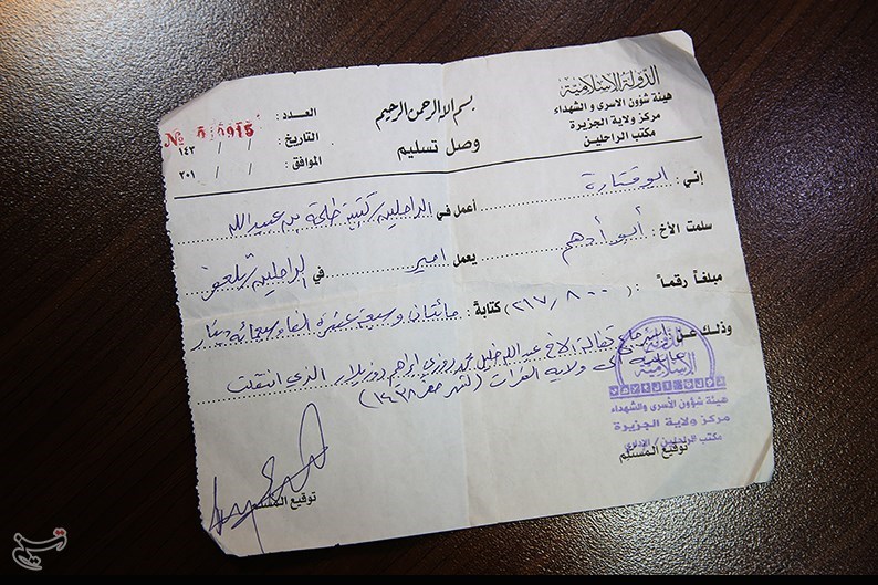 برگه رسید پرداخت پول به خانواده اعضای بههلاکترسیده یا اسیر داعش