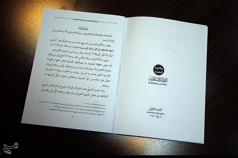عنوان این کتاب 60صفحهای «مفید المستفید فی کفر تارک التوحید» تألیف محمدبن عبدالوهاب است که توسط داعش به چاپ رسیده است.