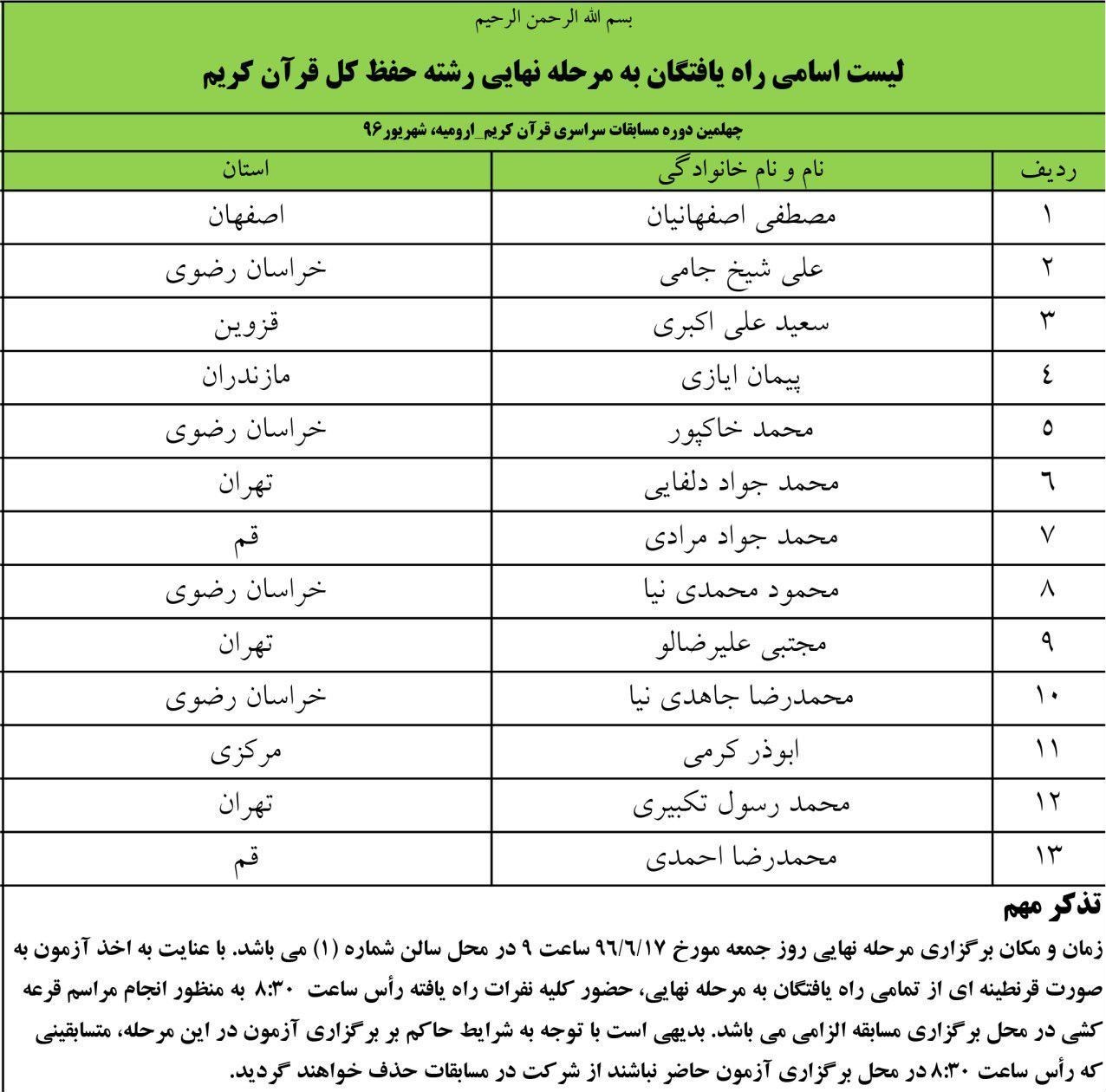 13 نفر به مرحله نهایی حفظ کل چهلمین دوره مسابقات سراسری قرآن راه‌یافتند.