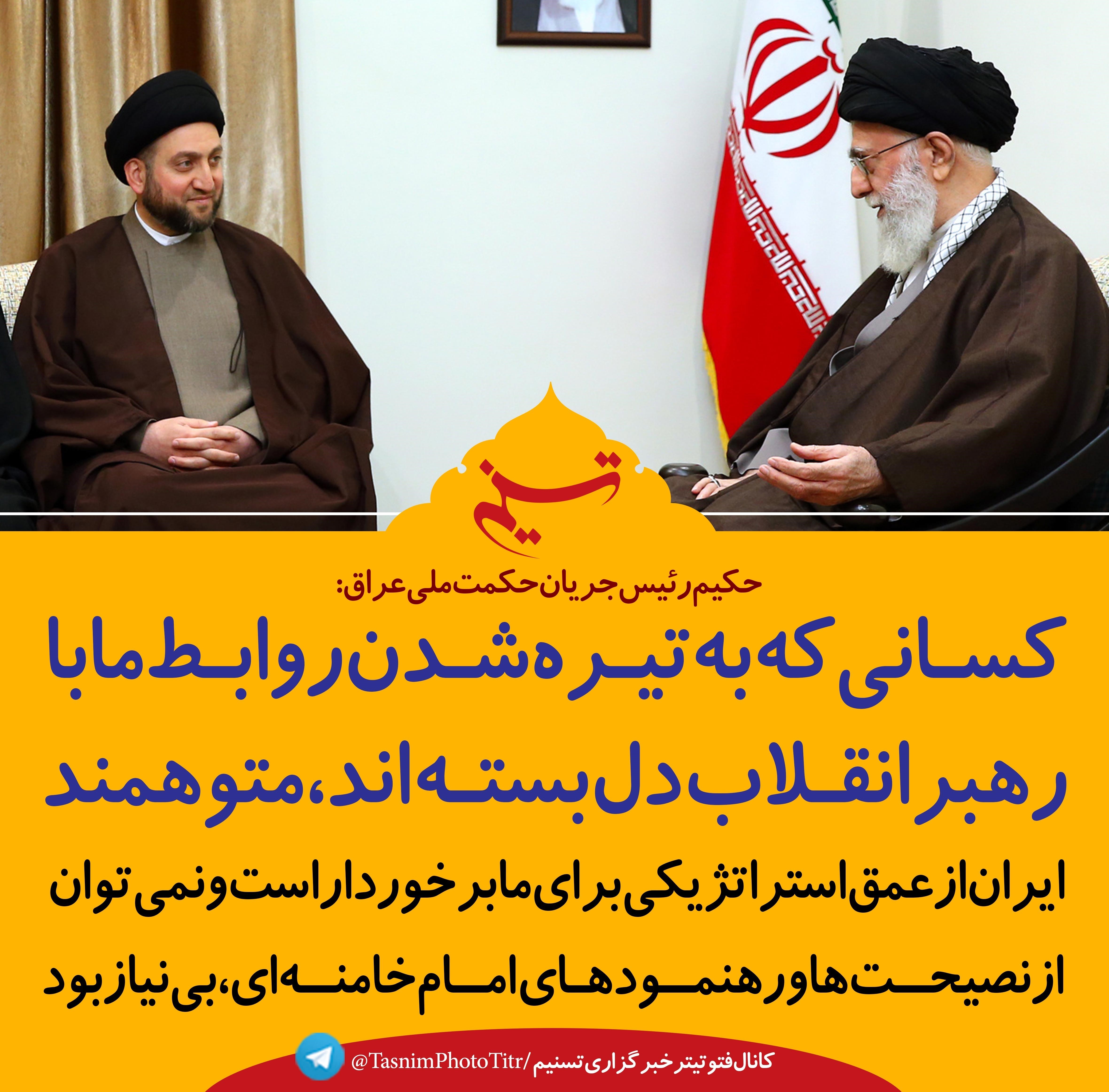 رئیس جریان حکمت ملی عراق با بیان " کسانی که به تیره شدن روابط ما با رهبر انقلاب دل بسته‌اند، متوهمند"، گفت: نمی‌توان از رهنمودهای امام خامنه‌ای بی‌نیاز بود.