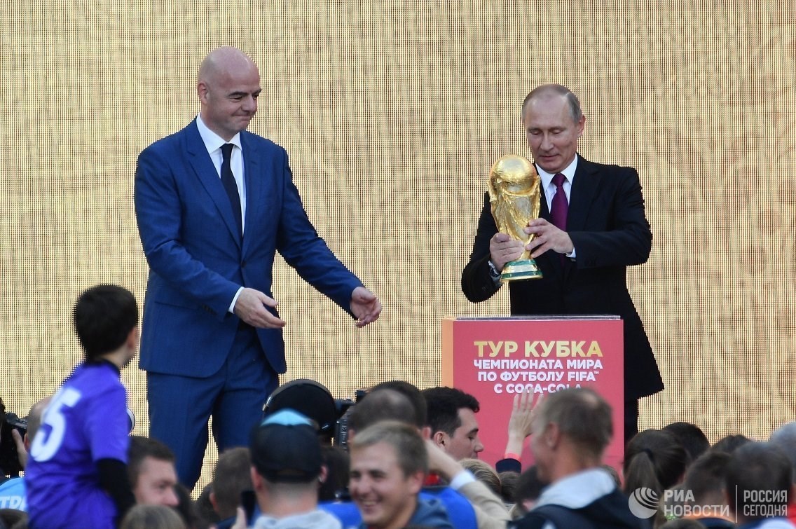 به گزارش خبرگزاری تسنیم، ولادیمیر پوتین (رئیسجمهور روسیه)، جانی اینفانتینو (رئیس فیفا)، بِبتو و دیوید ترزهگه (2 ستاره پیشین فوتبال برزیل و فرانسه) به همراه ویتالی موتکو (معاون نخستوزیر روسیه و رئیس کمیته سازماندهی جامجهانی 2018) امروز (شنبه) در مراسم شروع سفر جام جهانی به 50 کشور دنیا که در ورزشگاه لوژنیکی مسکو برگزار شد، شرکت کردند.