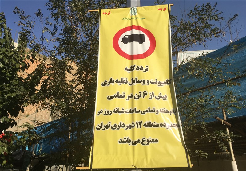 در متن نوشته شده از سوی معاونت حمل و نقل و ترافیک شهرداری تهران بر روی بنرهای نصب شده در معابر اصلی مرکز شهر، آمده: «تردد کلیه کامیونت و وسائل نقلیه باری بیش از 6 تن در تمامی ایام هفته و تمامی ساعات شبانه روز در محدوده منطقه 12 شهر تهران ممنوع میباشد».