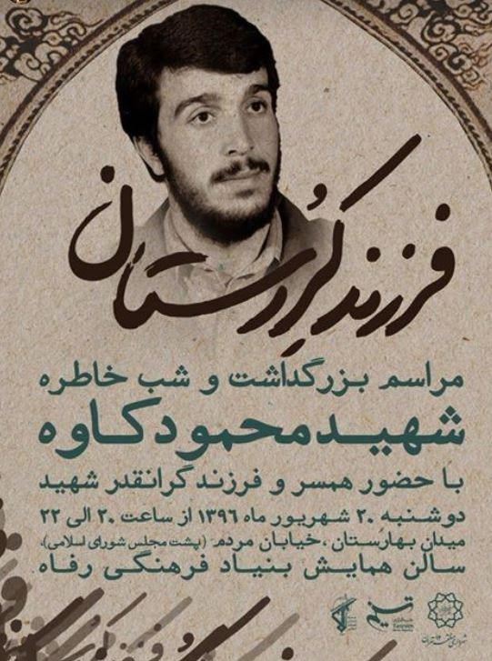 به گزارش خبرنگار فرهنگی باشگاه خبرنگاران پویا, مراسم بزرگداشت یاد سردار شهید محمود کاوه با عنوان«فرزند کردستان» امشب دوشنبه 20 شهریور 96 با حضور همسر و فرزند شهید کاوه و جمعی از همزمان او برگزار میشود.
