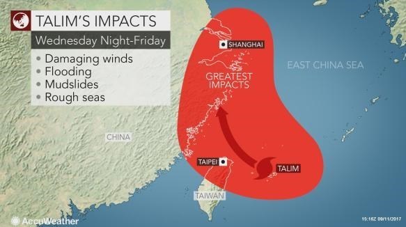 بر اساس پیش‌بینی‌ها طوفان «تالیم» نزدیک به 4 تا 5 درجه قدرت خواهد داشت که بالاترین وزش باد برای یک طوفان محسوب می‌شود و از روز شنبه گذشته در فیلیپین شکل گرفته و جزیره تایوان و استان فوجیان در جنوب شرق چین را تحت تاثیر قرار خواهد داد.