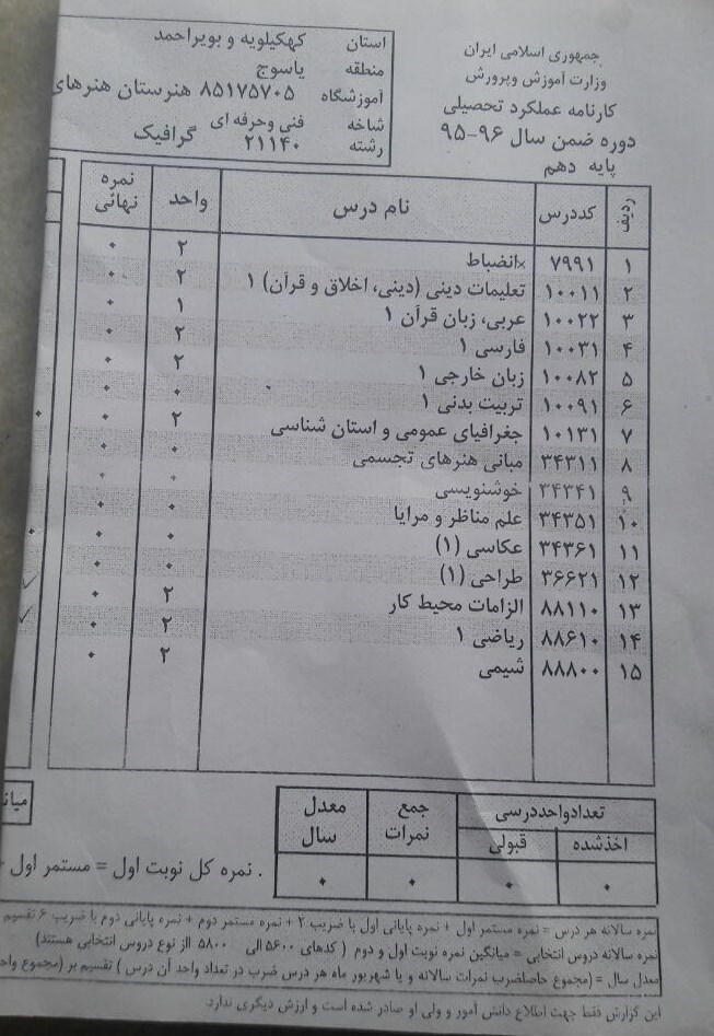 به گزارش خبرگزاری تسنیم از یاسوج، دانش آموزان پایه دهم رشته گرافیک که در سال تحصیلی جاری در هنرستان دولتی دخترانه هنرهای زیبای یاسوج مشغول به تحصیل هستند الان متوجه شدند که درس دو واحدی تاریخ هنر ایران را نخواندهاند.