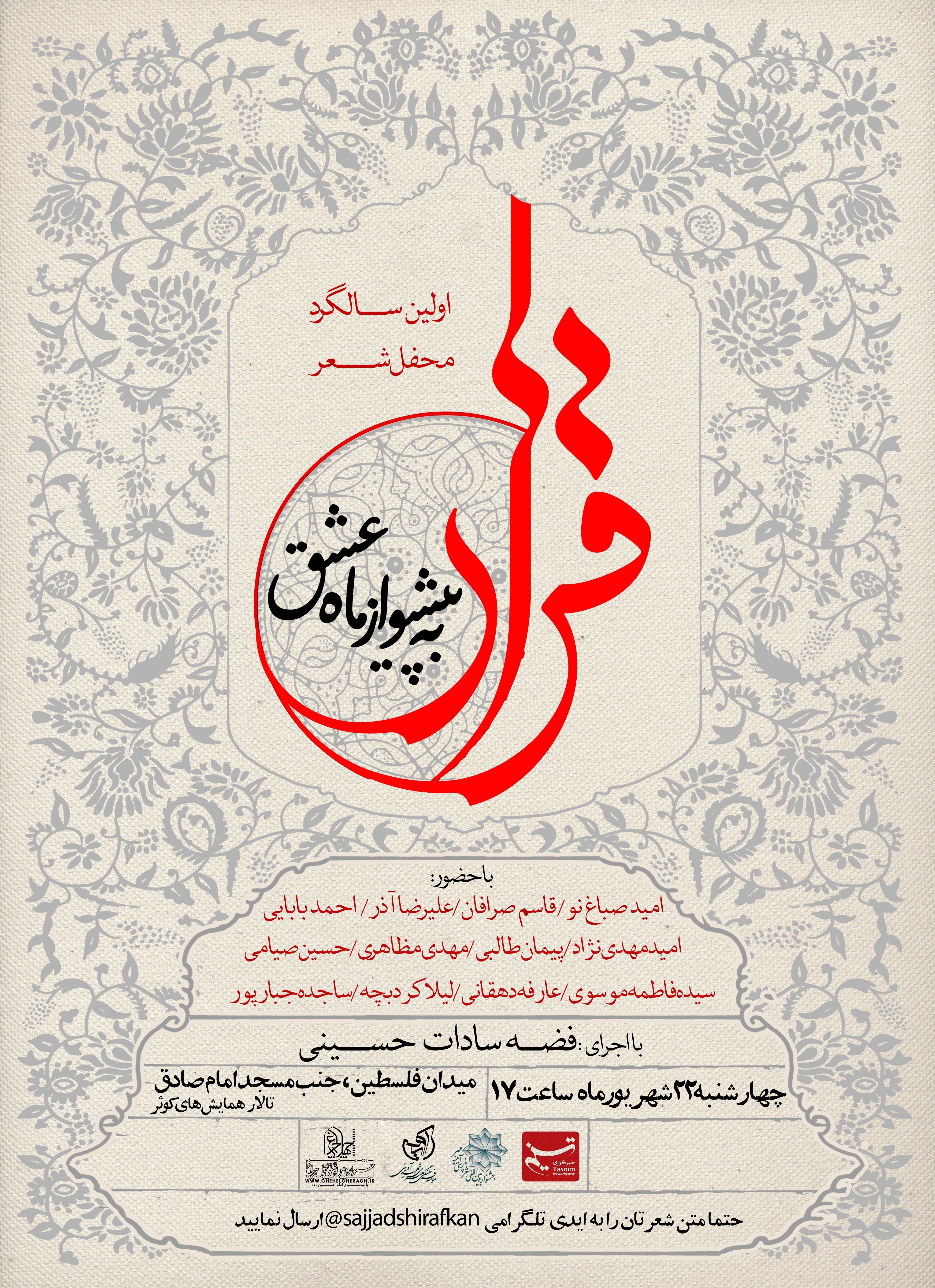 در این محفل که بههمت خبرگزاری تسنیم، دبیرخانه آیینه مهر و موسسه فرهنگی هنری شهید آوینی برگزار خواهد شد، جمعی از شاعران بنام کشور از جمله احمد بابایی، قاسم صرافان، امید صباغ نو، علیرضا آذر، امید مهدی نژاد، پیمان طالبی، حسین صیامی،مهدی مظاهری، سیده فاطمه موسوی، لیلا کردبچه، عارفه دهقانی و ساجده جبار پور حاضر شده و به شعرخوانی خواهند پرداخت.
