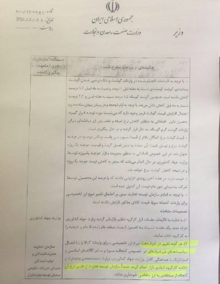 هرگونه تغییر در تعرفههای نرخ ارز تخصیصی برای واردات کالا و یا اعمال سیاستهای غیرتعرفهای در خصوص کنجاله سویا و سایر کالاهای اساسی استراتژی با هماهنگی کامل وزارت جهاد کشاوری، وزارت صنعت، معدن و تجارت و ابلاغیه کارگروه تنظیم باراز انجام گردد. ضمنا سازمان توسعه تجارت از تغییر نرخ ارز کنجاله از مبادلهای به ارز متقاضی خودداری نماید.