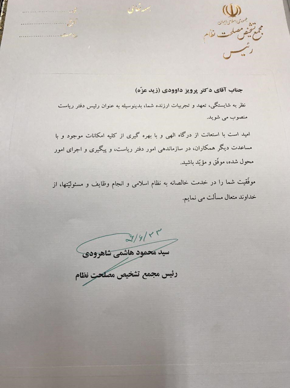 پرویز داودی در گفتوگو با خبرنگار سیاسی خبرگزاری تسنیم این خبر را تأیید کرد و گفت که با نظر آیتالله هاشمیشاهرودی برای ریاست دفتر وی تعیین شده است.