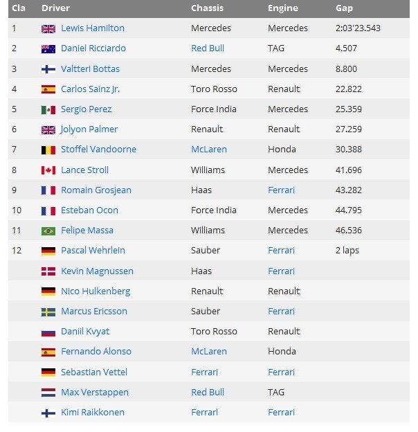 قهرمانی همیلتون در حالی اتفاق اقتاد که سباستین فتل و کیمی رایکونن، 2 راننده تیم فراری در ابتدای مسابقه، تصادف شدیدی داشتند و هر دو از جریان رقابت خارج شدند. بارندگی و لغزندگی پیست، دلیل اصلی این تصادف شد.